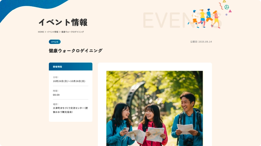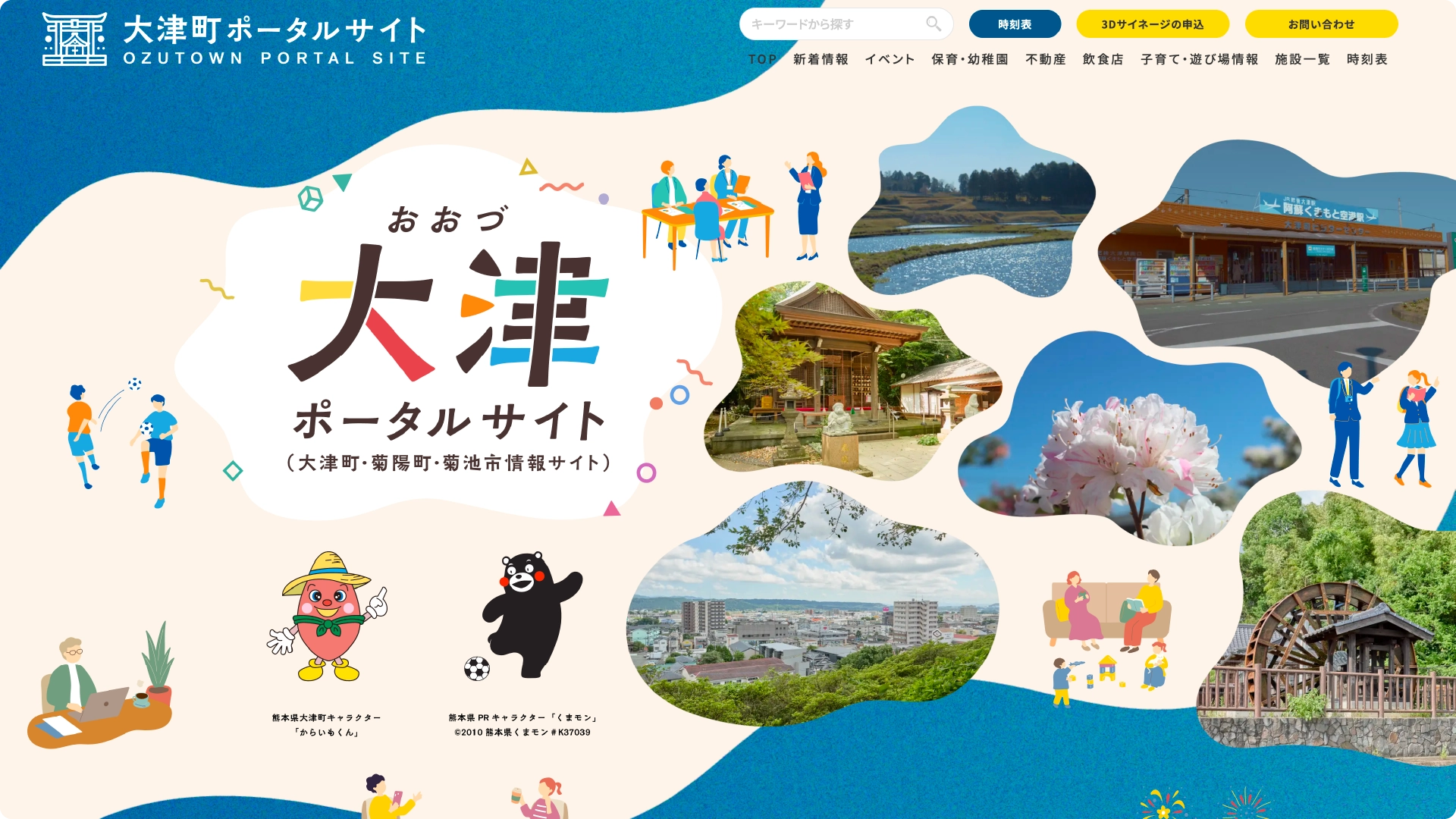 大津町ポータルは、だれでも使いやすく、知りたい情報をすぐ見つけられる地域ポータルです。全体の雰囲気は明るく元気。青のグラデーションを土台に、目立たせたいところに黄色を使って、見た目をすっきり統一しました。毎日使っても疲れない、安定した使い心地を大切にしています。