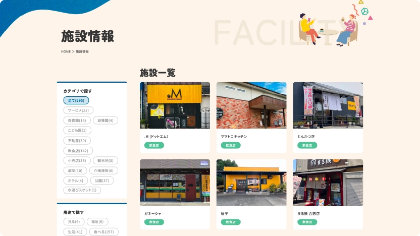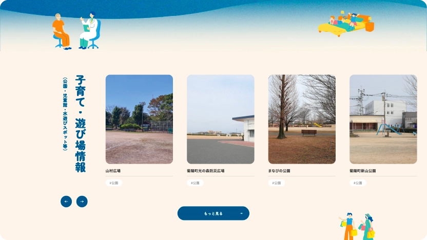 写真は風景や施設を中心に掲載し、地域の雰囲気がまっすぐ伝わるようにしました。情報はカード状の一覧で整理して見比べやすくし、まずは「一覧でざっと見る → 気になる情報の詳細へ進む」という流れがスムーズになるよう設計。地図や絞り込みはサポートとして用意し、必要なときに使える位置づけです。青のグラデーションで清潔感と信頼感を、黄色で大事なボタンやお知らせをはっきり目立たせ、初めての方でも迷わず目的にたどり着けるデザインを目指しました。