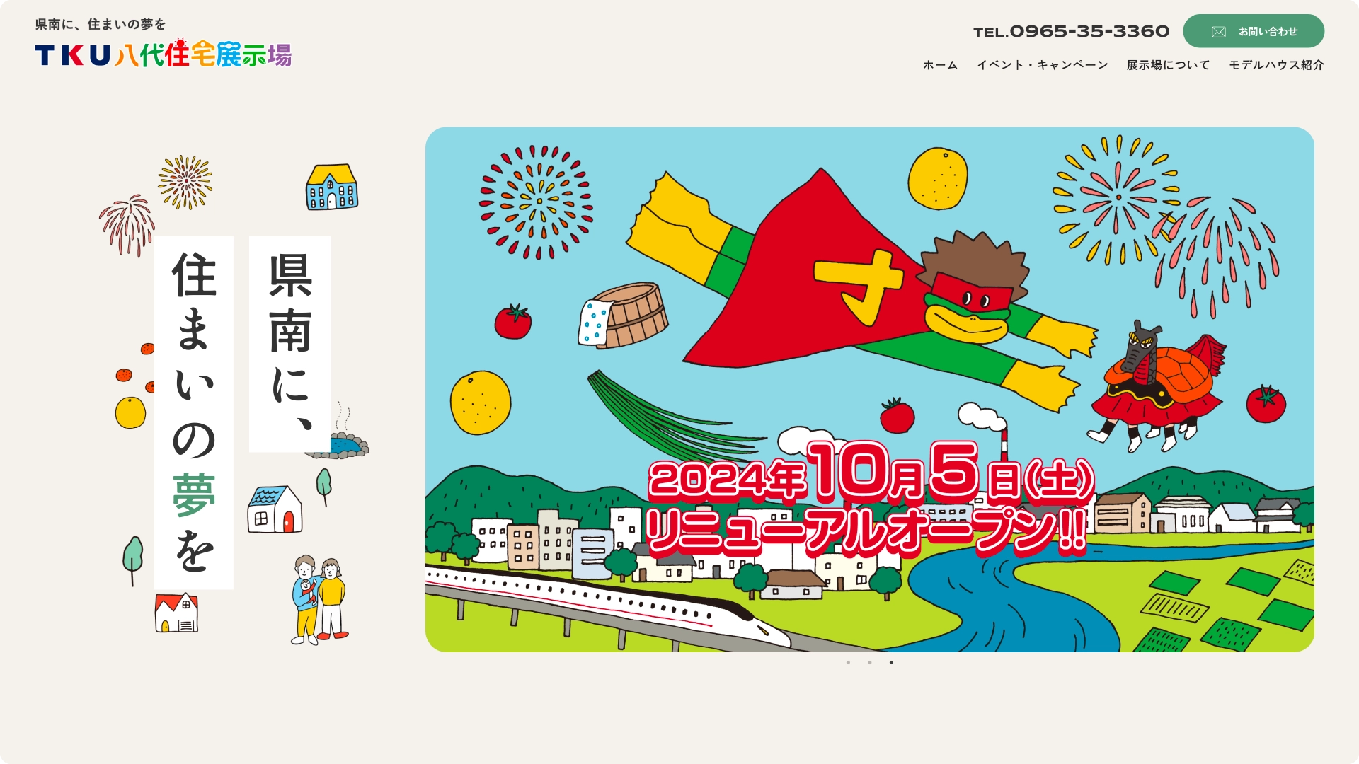 TKU八代住宅展示場の公式サイトは、地域の皆さまに実際に見学へ来ていただくことを一番の目的としてリニューアルしました。トップページから「イベント・キャンペーン」「展示場について」「モデルハウス紹介」へ迷わず進めるつくりにし、来場前の不安を解消しながら、自然に見学予約へ進める導線を整えています。全体の色はベージュをベースに緑をメインカラーとしたやさしい配色にし、見やすさと親しみやすさを大切にしました。
