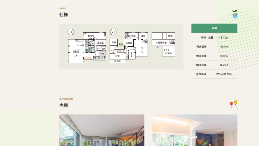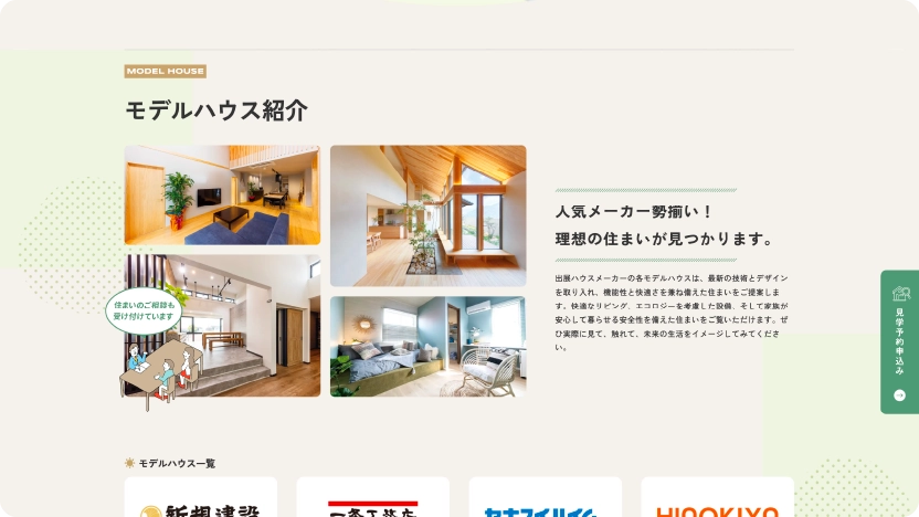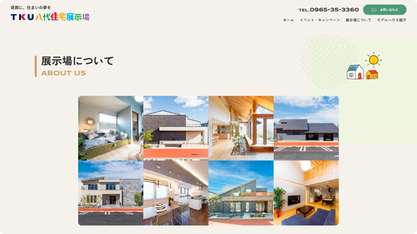 TKU八代住宅展示場の公式サイトは、地域の皆さまに実際に見学へ来ていただくことを一番の目的としてリニューアルしました。トップページから「イベント・キャンペーン」「展示場について」「モデルハウス紹介」へ迷わず進めるつくりにし、来場前の不安を解消しながら、自然に見学予約へ進める導線を整えています。全体の色はベージュをベースに緑をメインカラーとしたやさしい配色にし、見やすさと親しみやすさを大切にしました。