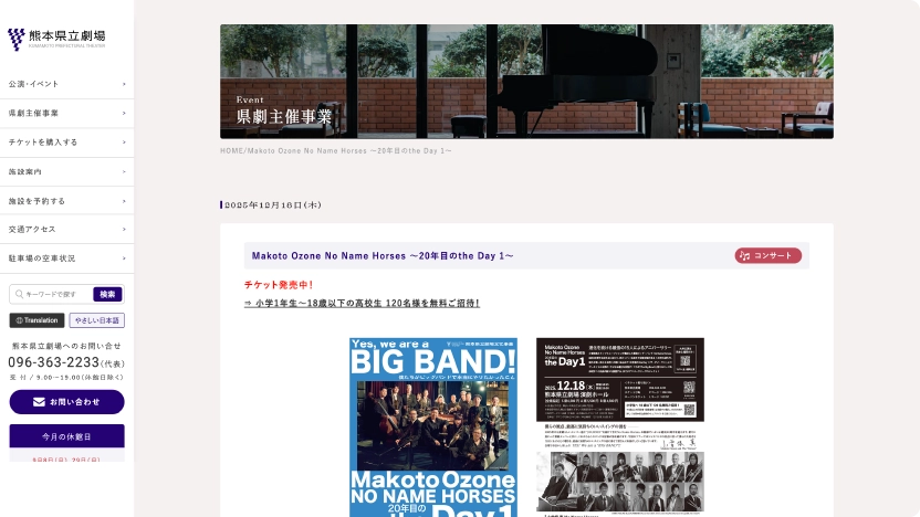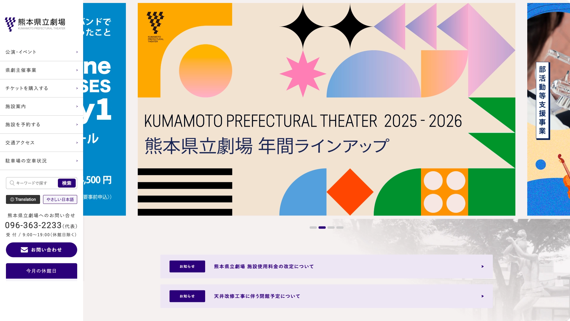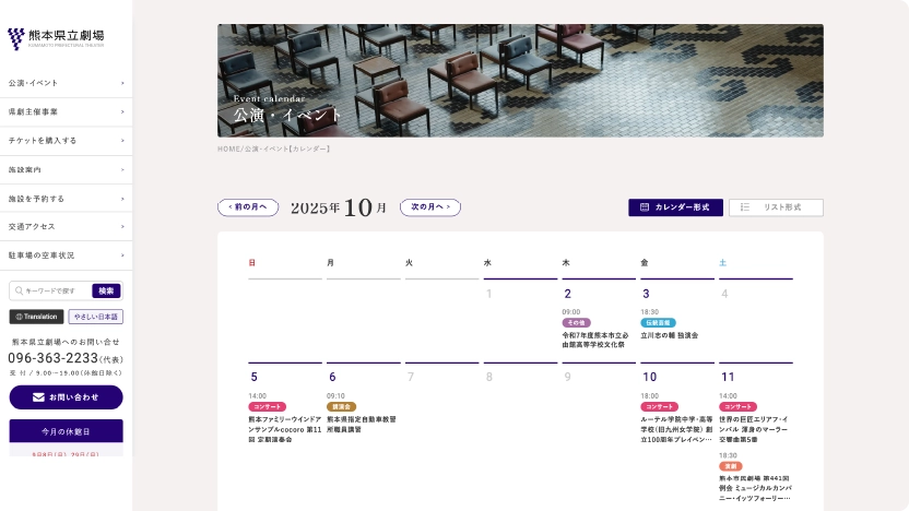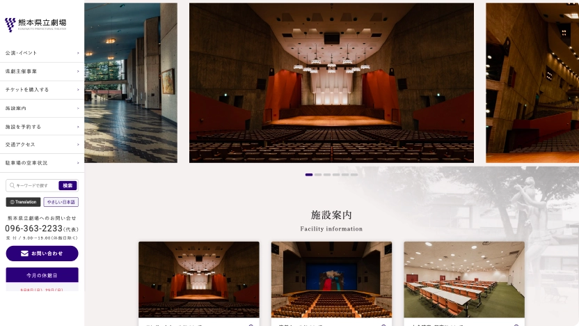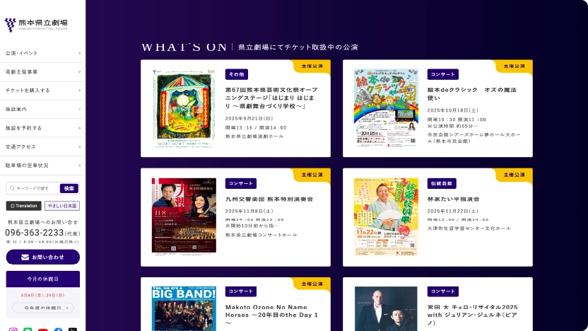 熊本県立劇場の公式サイトは、「安心して来館できること」と「“行ってみたい”を後押しすること」をデザインの中心に据えてリニューアルしました。全体の色はロゴに合わせた紫を主役に、白と淡い紫で整え、落ち着きと信頼感をキープ。公的施設らしい端正さを保ちつつ、初めての方にも近づきやすい親しみを目指しています。